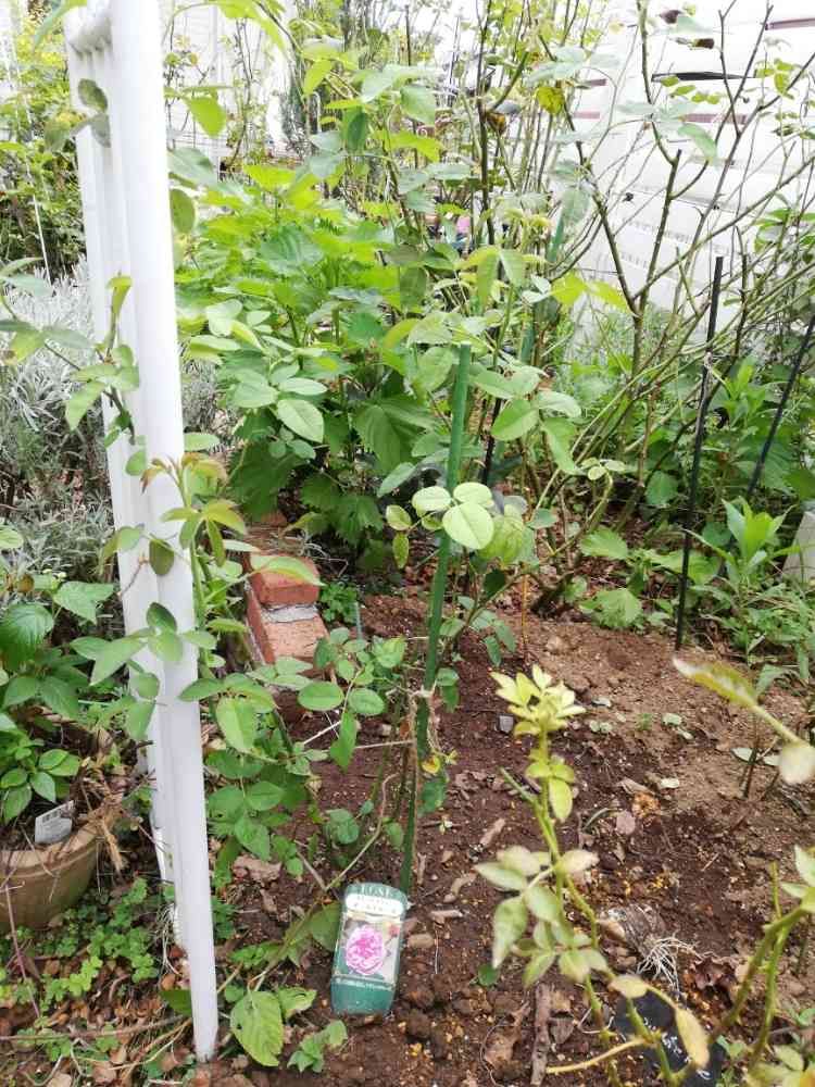 アーチに誘引してあったレオナルド・ダ・ヴィンチが、カミキリムシでだめになってしまったため、ルイーズオディエに植え替えました。