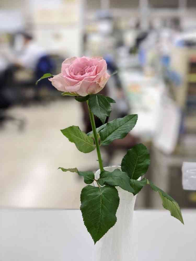 仕事終わりに花をもらい、早速職場に飾りました✨スイートアバランチェという品種のバラです🌹