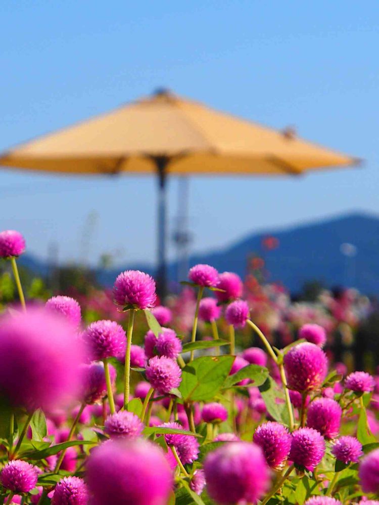 このアングル、相当考えたんじゃ❔低い位置で撮影したけん、青空の青、千日紅の赤、和傘、背後の山が、一直線に並び素敵やわ🤗
