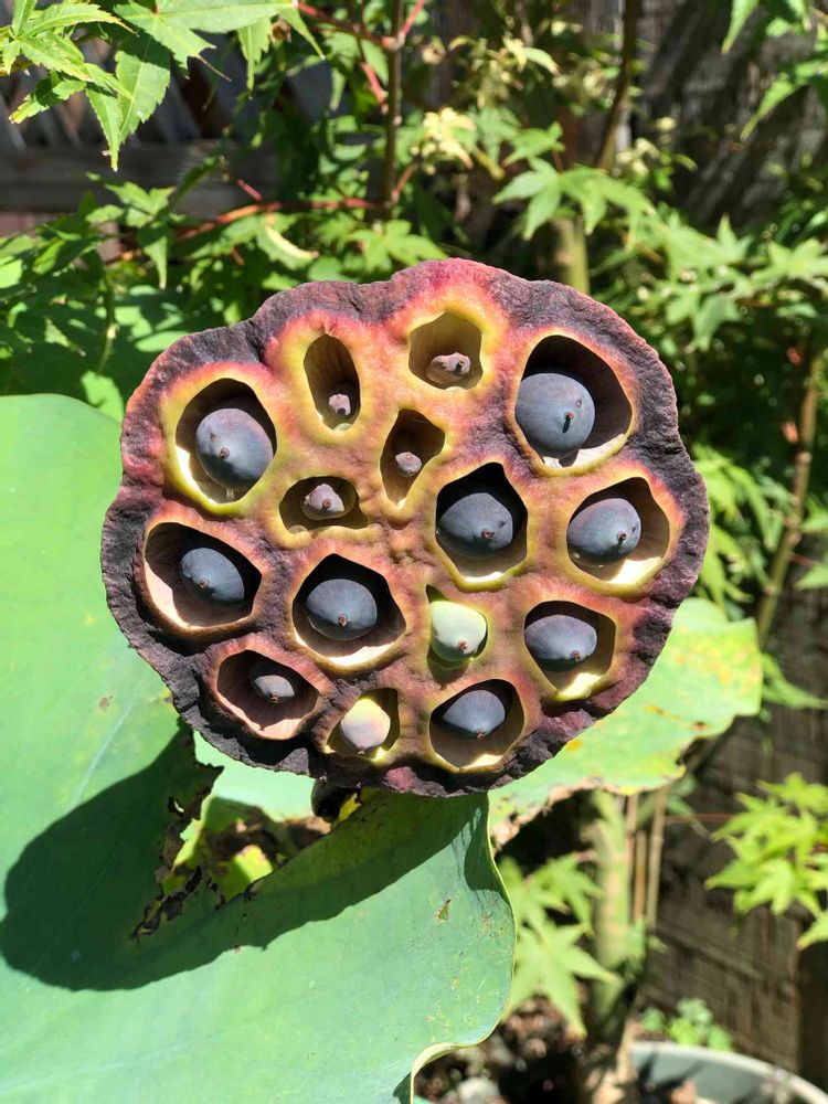 その後のハスの種🌸こんな感じ😅グロくてすみません😆 取って良いのか分からずそのままです😆 お盆でハスの葉を切って花瓶や精霊棚に飾りましたが、ハスの葉って水を吸わず、直ぐに丸まってしまうのですね!知りませんでした!