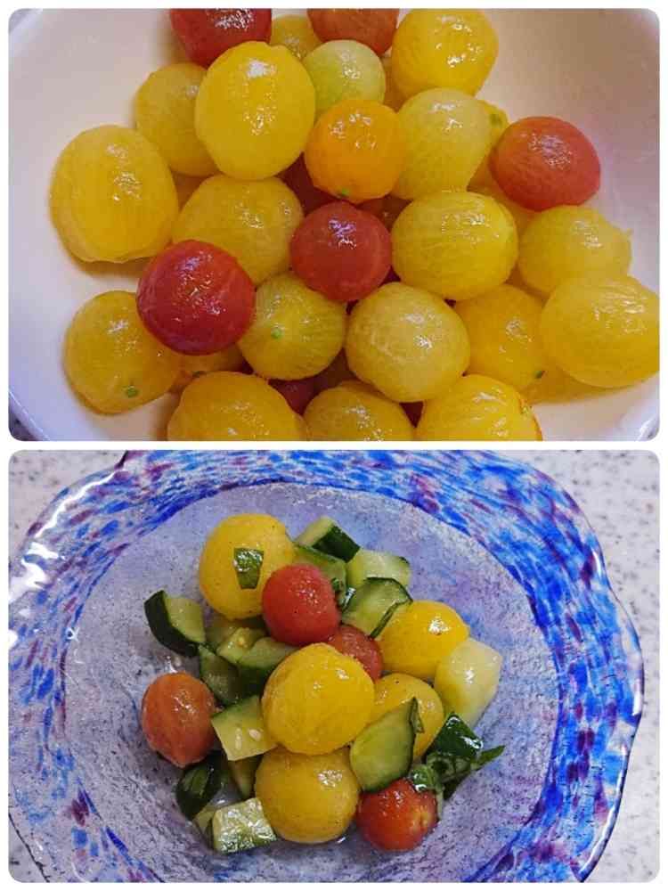 ミニトマト🍅、皮が固くて、そのままだと口に残るので、面倒だけど、剥きました。