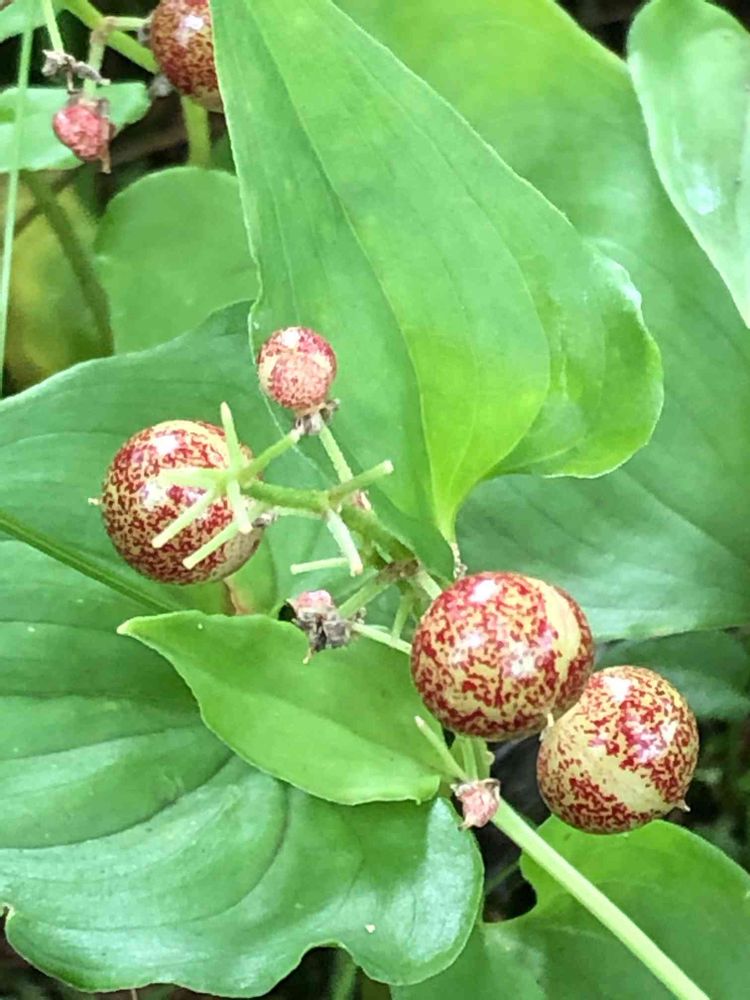7月24日、奥日光湯川を離れ、小田代ヶ原へ向かう途中、戦場ヶ原展望台付近の木の下に、宝石箱をひっくり返した様な、とても美しいキラキラ輝く小さく可愛い💕❤️、葉の形や花のつき方に良く似た実のつき方から、「舞鶴草(マイヅルソウ)」の実らしきものを見つけました❣️