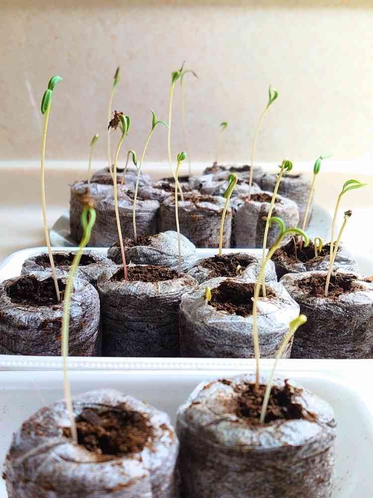 ジフィーセブンという種まき用土に八重咲きのコスモスの種をまいたら、たった1日半で芽が出始めて驚きました。にょきにょき。