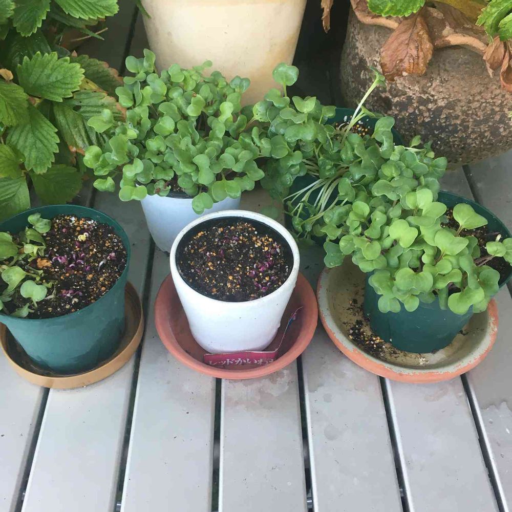 気温は高いけれど湿度が低いので、奥右鉢はやや萎れていました。前鉢の紫カイワレの芽が膨らみ始めています。