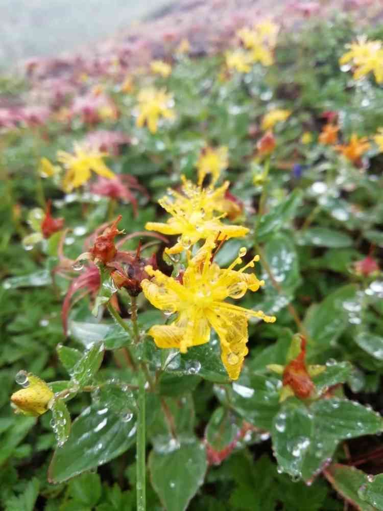 霧で濡れすぎて原型がわかりにくいですが、そのへんに生えてるオトギリソウを小さくした感じです。