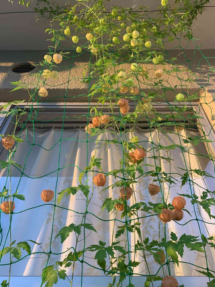 フウセンカズラと青空のカーテンも夕日のカーテンも素敵です💕綺麗に実りましたね〜とってもおしゃれ💖💕