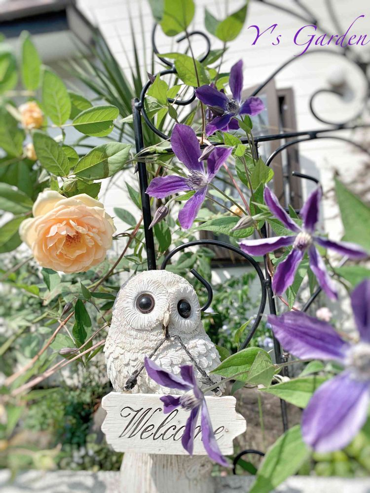 バラとクレマチスとフクロウさんの競演、とても雰囲気が良いですね✨