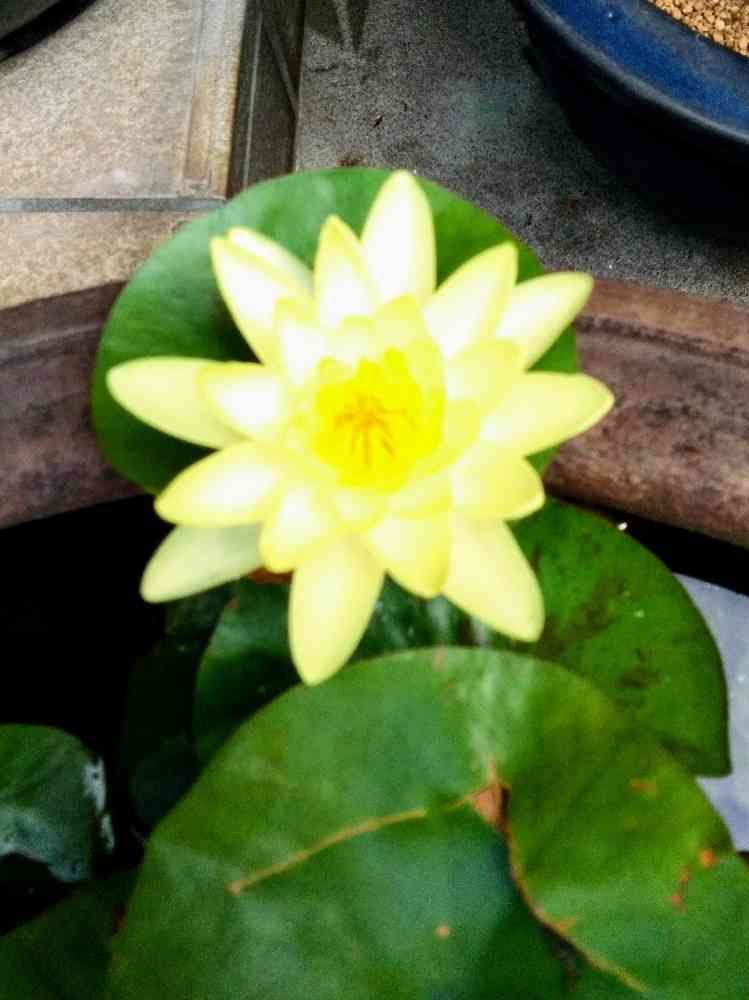 知人宅を訪ね、庭に置かれた火鉢に、黄色い睡蓮が、咲いていました。
