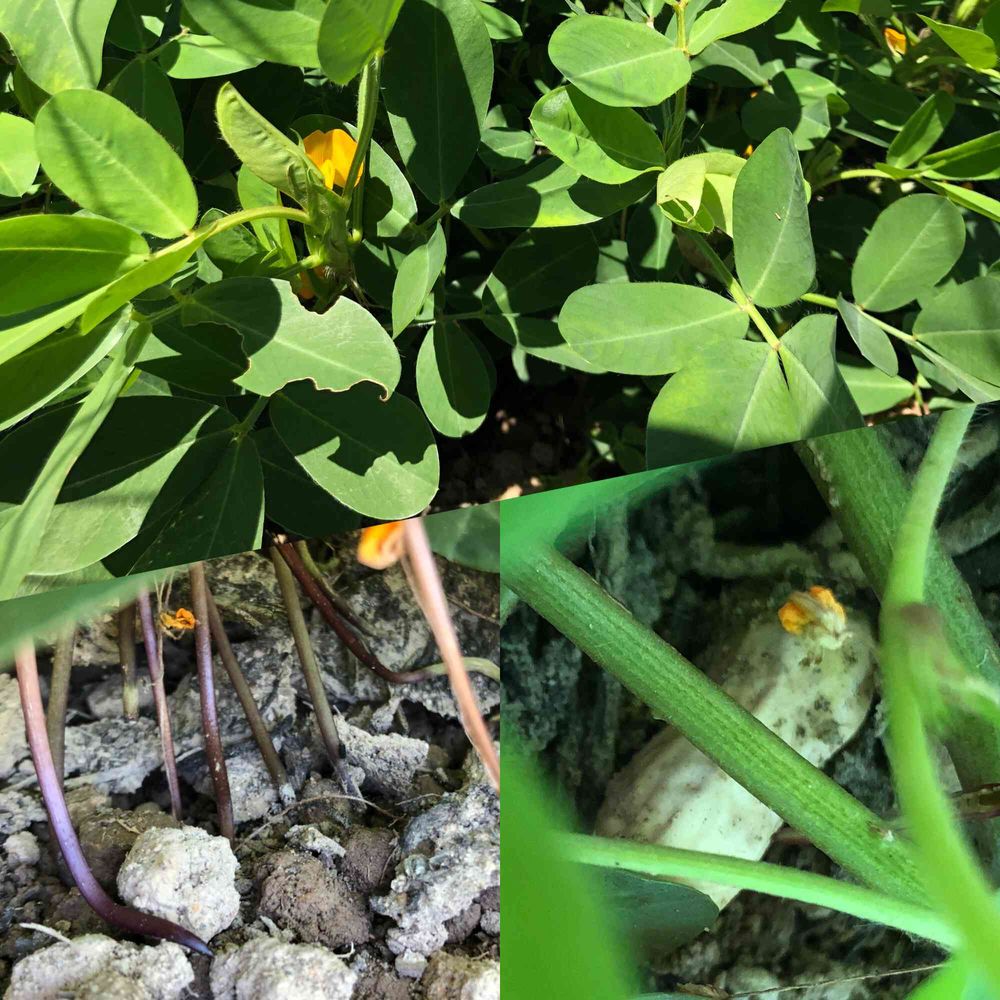 ピーナツが茂り、花下から伸びた子房柄が土に突き刺さるように伸びて(左下)その先端が膨れて実になってます(右下)