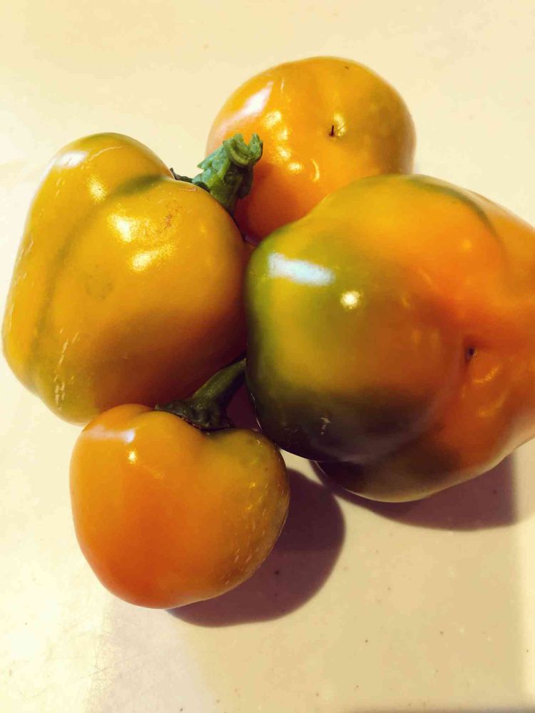 キレイに黄色くなる前にシワが出てきたのと、一つカラスに食べられたので、パプリカ収穫です。