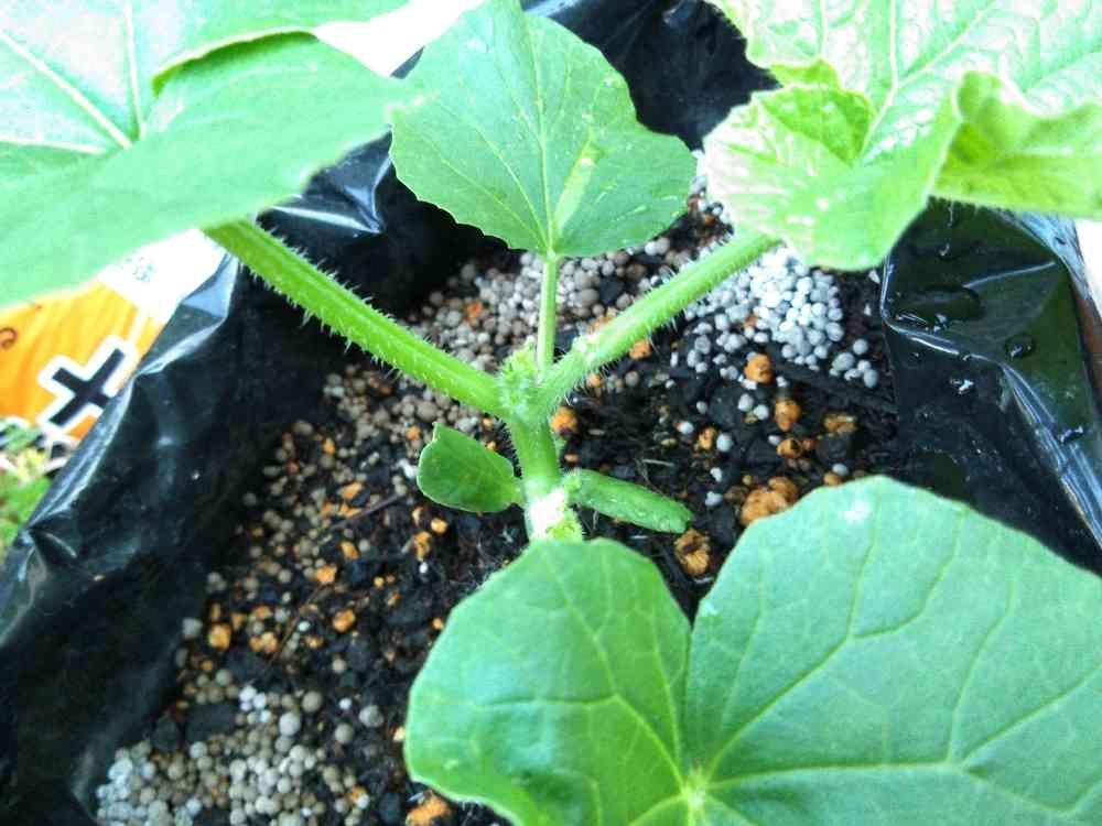 本番4枚が出揃ったので、地植えの2本と袋栽培の2本のうち1本を摘心しました。