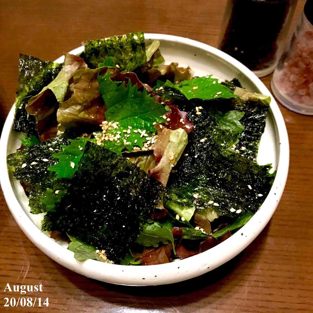 ベランダの大葉でサニーレタス(買ってきたやつ)と韓国海苔のサラダを作りました。