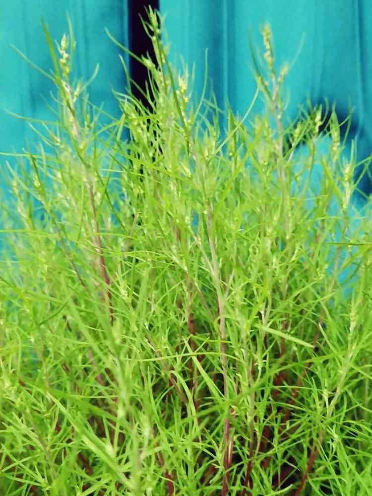 コキアさんの先っちょにお花付いてる??余りの暑さにクーラーが当たらない部屋の隅に置きました。