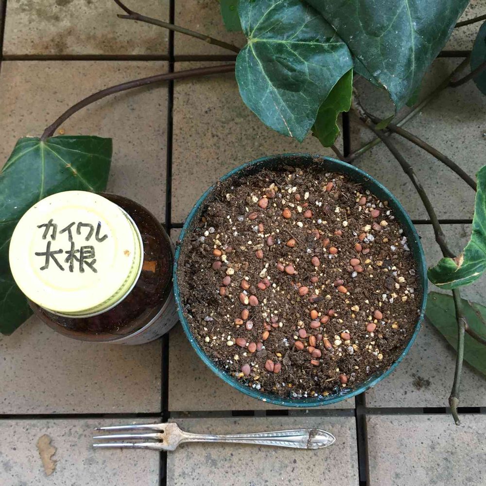 普通のカイワレ大根種を蒔きました。あまり密にしません。この後薄く種まき培土を掛けます。