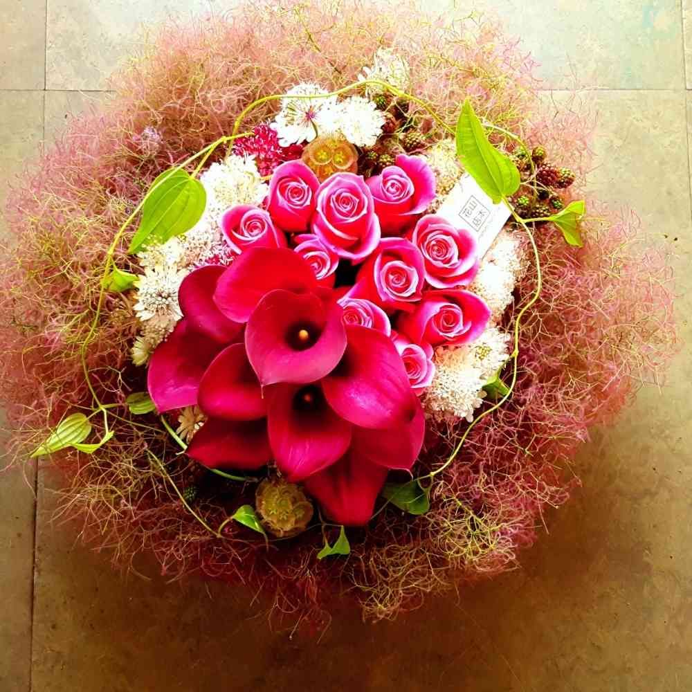 お出かけ先,使用花材 バラ(タージマハル) カラー スモークツリー マイヨール スカビオサ(2種類) ブラックベリー ステルンクーゲル リキュウソウ,花のある暮らしの投稿画像