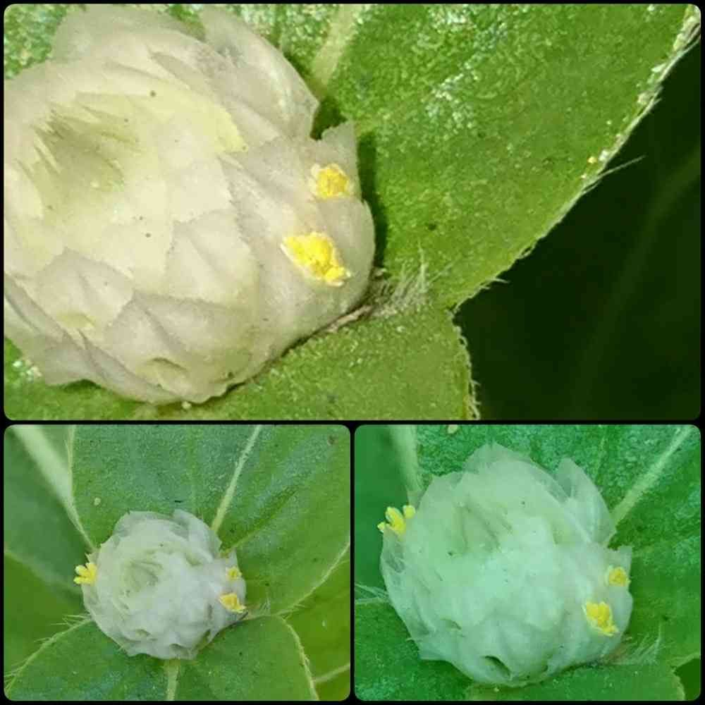 それでもよーく見ると、苞と同色の白い小さな花と、その中から黄色の雄しべが……🌼✨