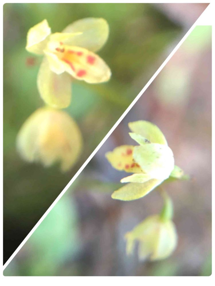 🌲🌲背の低い針葉樹林帯の登山道脇にとても小さな小さな💛花