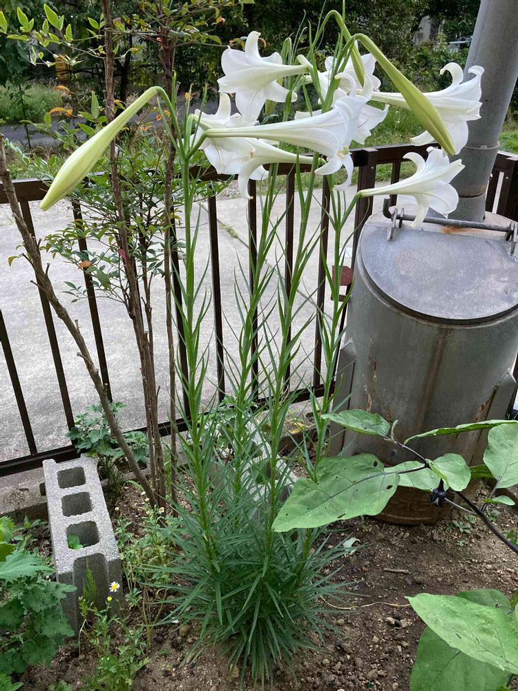 葉が細いので、タカサゴユリとの交雑種、シンテッポウユリと呼ばれるものかも知れません。