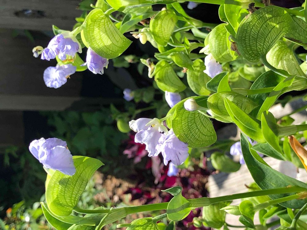 豆の🌸かな?スイートピーのような薄紫系です。蔓っぽいのがあるのかないのかわかりませんが。