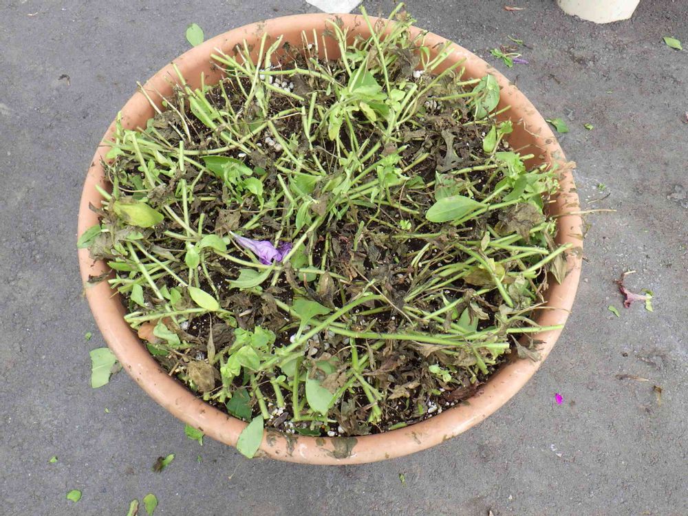 【切り戻し】先日、サフィニアの切り戻しを行いました。鉢の縁、内側を目途に刈り込みを行い、中心部分も下の培養土が見えるくらいまで調整しました。この後、中心にある枯葉やナメクジ(!?)を除去し化成肥料を与えました。「こんなにしちゃうの!?」と思われると思いますが、やらないとキレイな草姿(そうし)にならないので、やります^^すぐに中心部分から新しい葉が見えてくると思います♪楽しみですね~