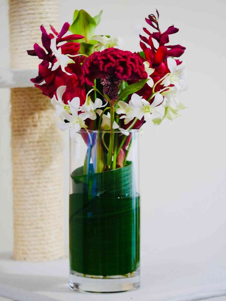 まだもう少し行けそうなジンジャーにクルクマとケイトウが加わり、ハランを貰ったので、お花屋さんのアレンジを真似っ子してフラワーベースの中で巻いてみました。