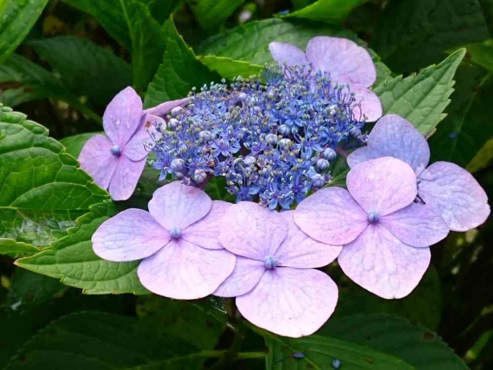 主人の昔すんでいた実家はポツンと一軒家にかなり近い山奥で、現在は小屋がひとつあるだけなのですが、そこに植えた額アジサイがまだまだ綺麗に咲いていました。