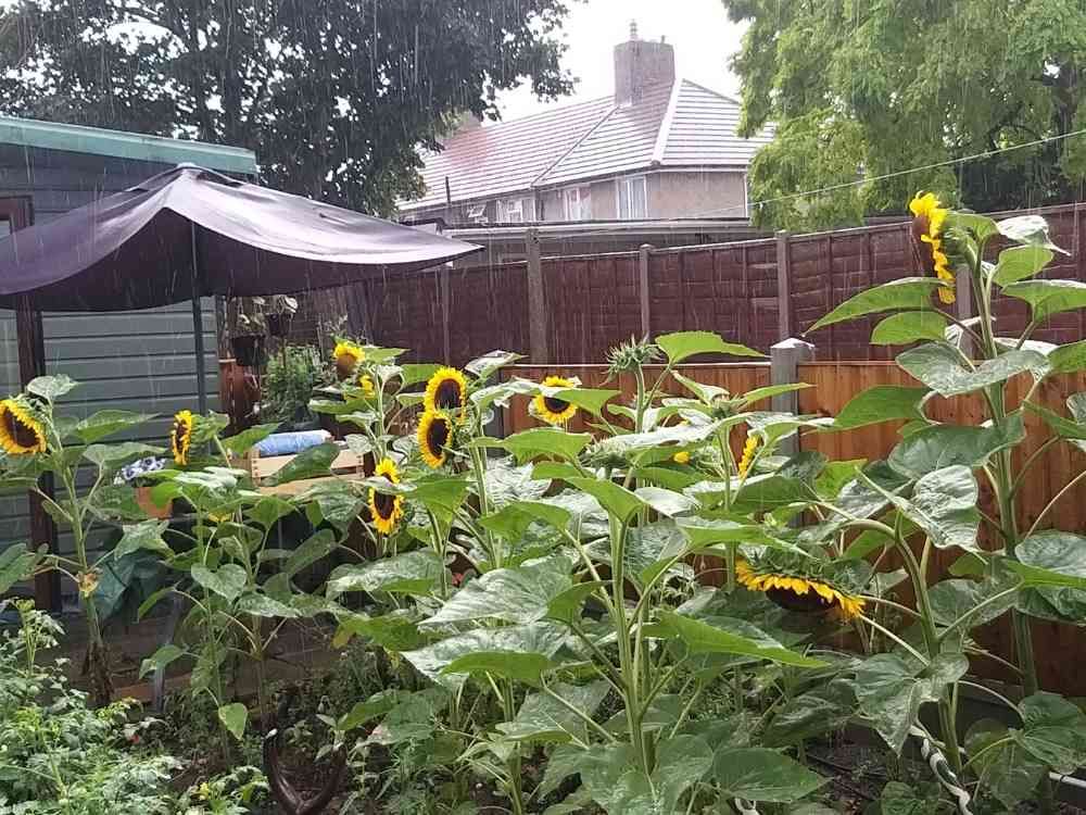 チビちゃんと頭が大きなひまわりが傾きかけています😨