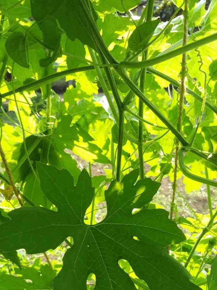 お散歩途中、ゴーヤの葉の下でひと休み。