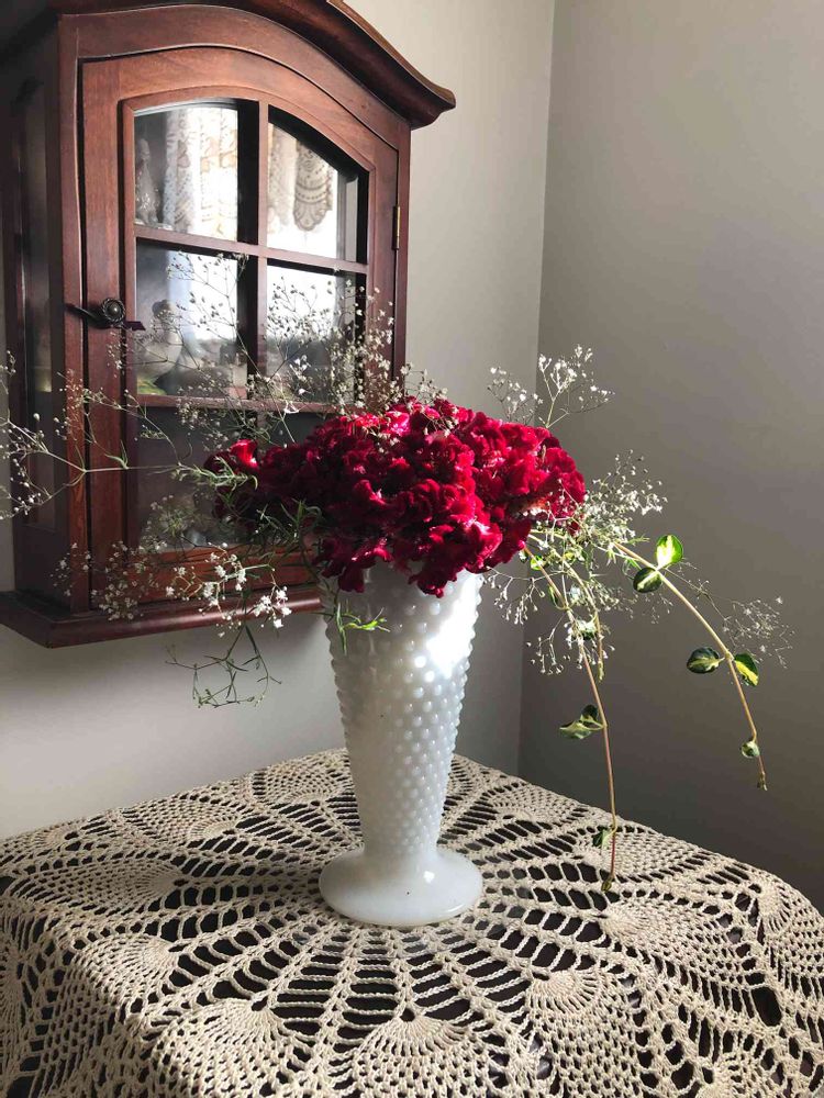 花材は鶏頭、かすみ草、クリーピングブルーセダム。ミルクグラスという70年前くらいのアメリカの花瓶に入れてます。