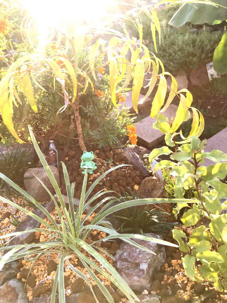 お庭のカエルさんは、今日も雨降らないし何して過ごそうかと、マホニヤの下でのんびり考えています🤣