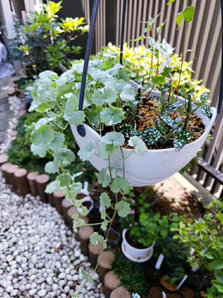どれも葉っぱ🌿が可愛いので、葉っぱだけの寄せ植え。100均のハンギングバスケットです☺️