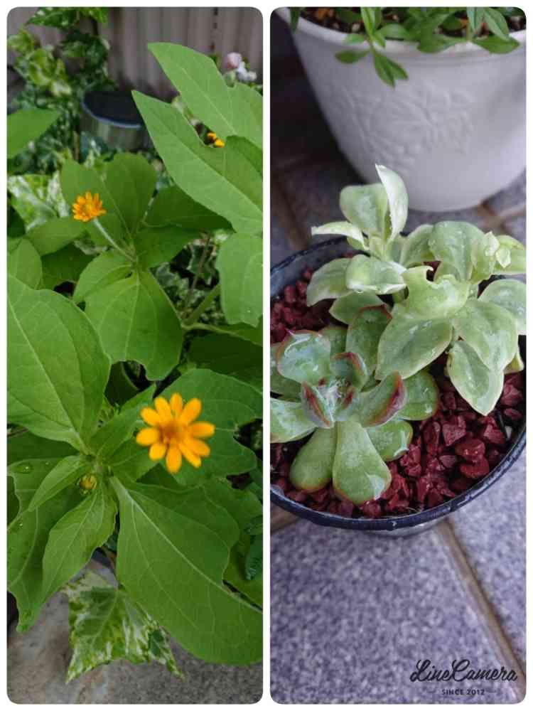 メランポジュームの葉っぱがバッタ君に食べられて・・近くにいたベビーサンローズにも穴が・・もしかして!バッタ君食べたの?(¯∇¯٥)