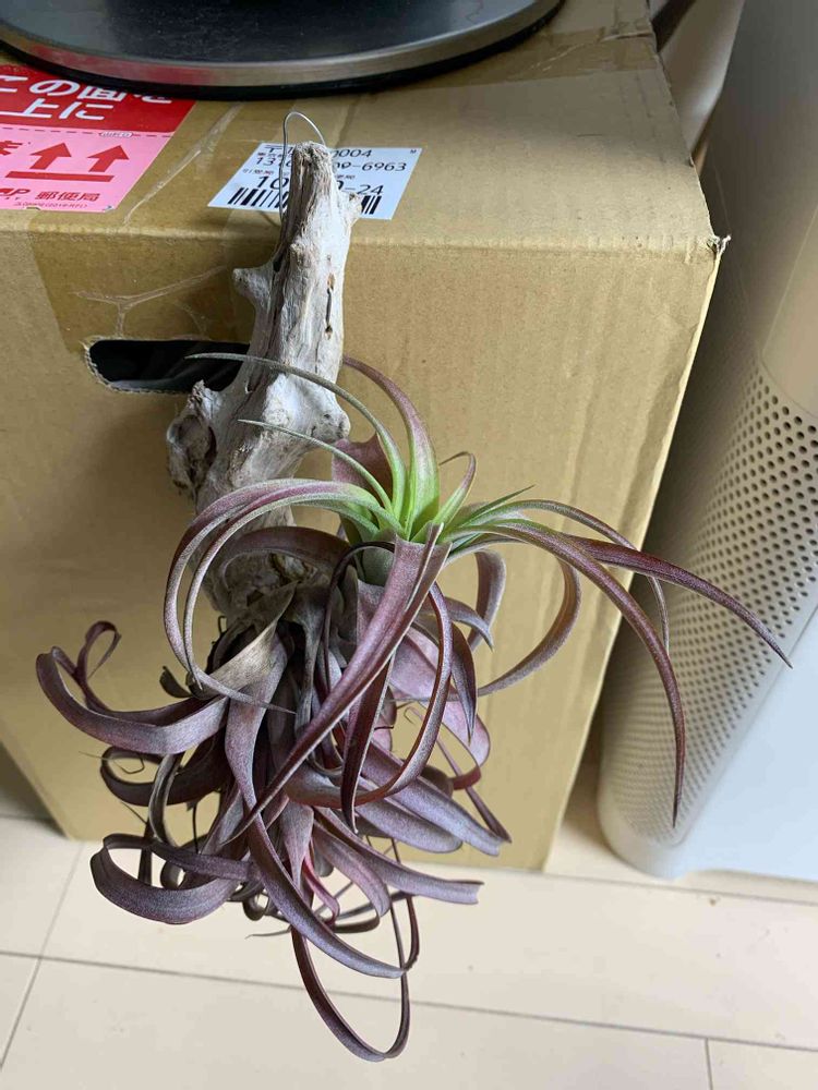 このチランジア結構かっこよくないですか?下の親株(もう体力がなくなって下の方重力で下の方へとへにゃっとなっています)と上の子株(張りがありバンバン伸びています。真ん中はみどり色)の親子ペアで存在感があります🎶この株は光を浴びるとアントシアニンが輝き、ワインレッド色に染まってくれる希少な交配株です🍷