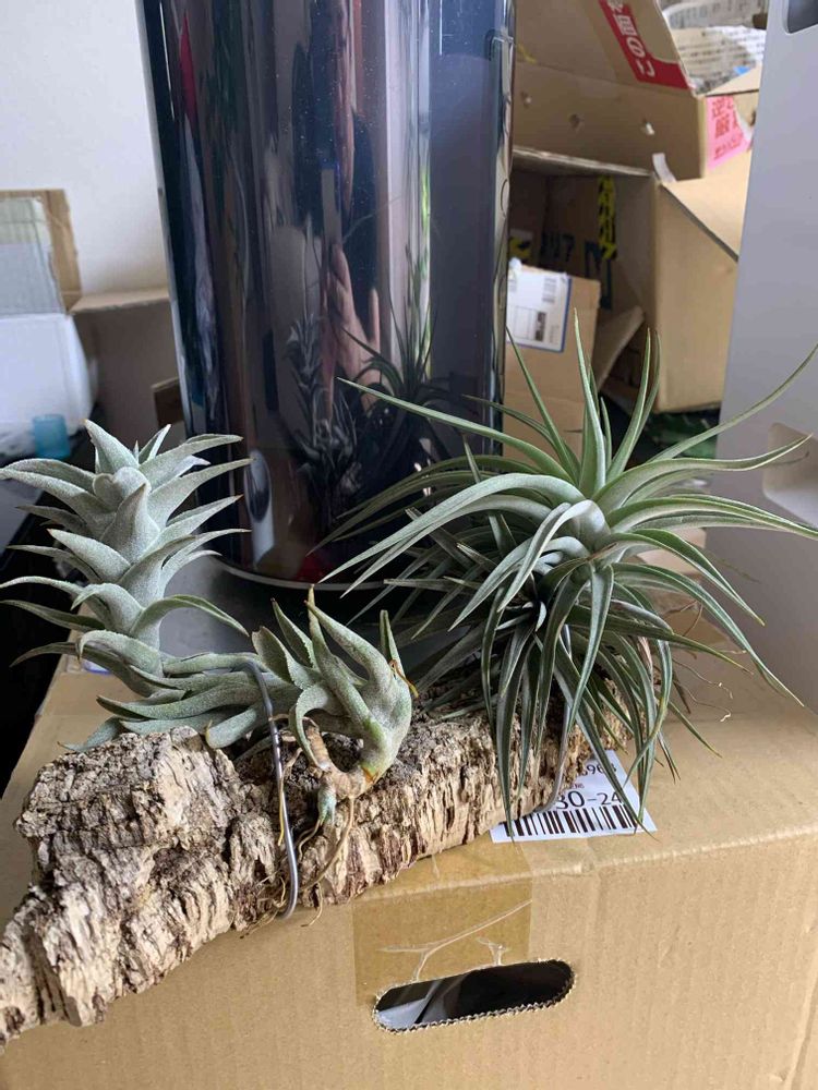 一年前に僕が生まれて初めてコルクに括り付けた二つのチランジア達です。針金は極太で、巻き方もめちゃくちゃですが、いつでも初心に帰れるように、当時から巻き方は変えていません。