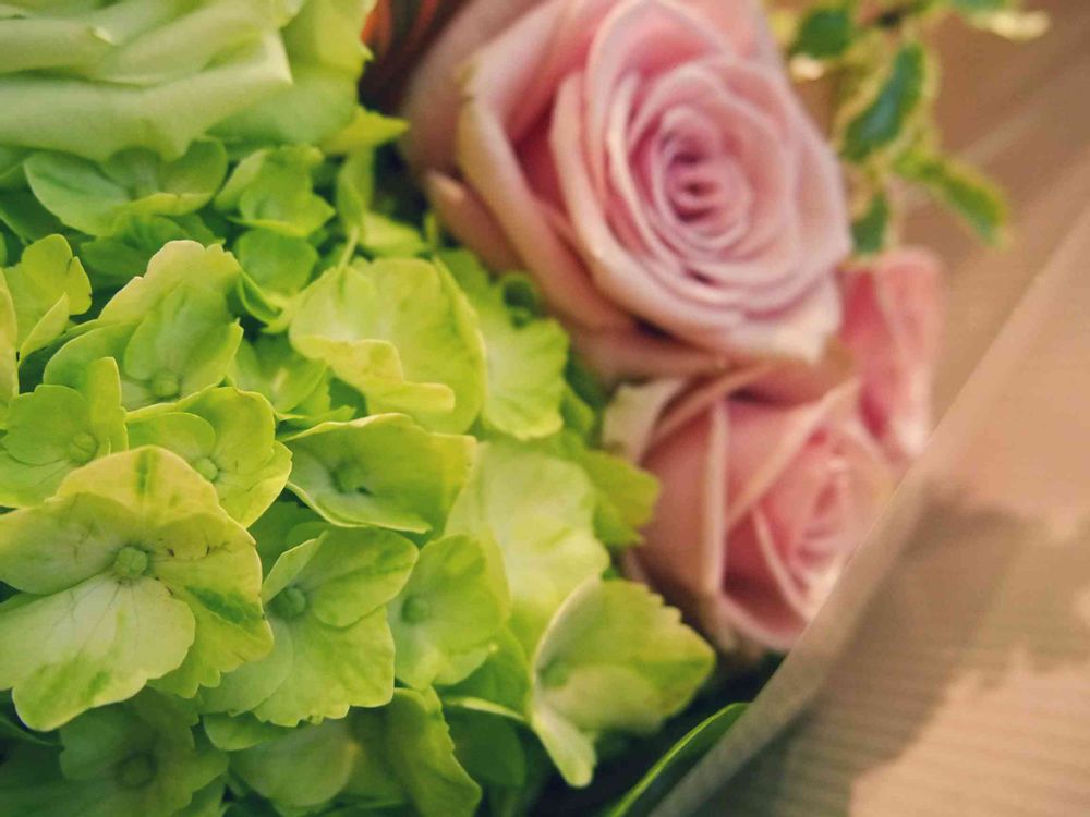 グリーンのアジサイとクラシカルなピンク色のバラがステキ!