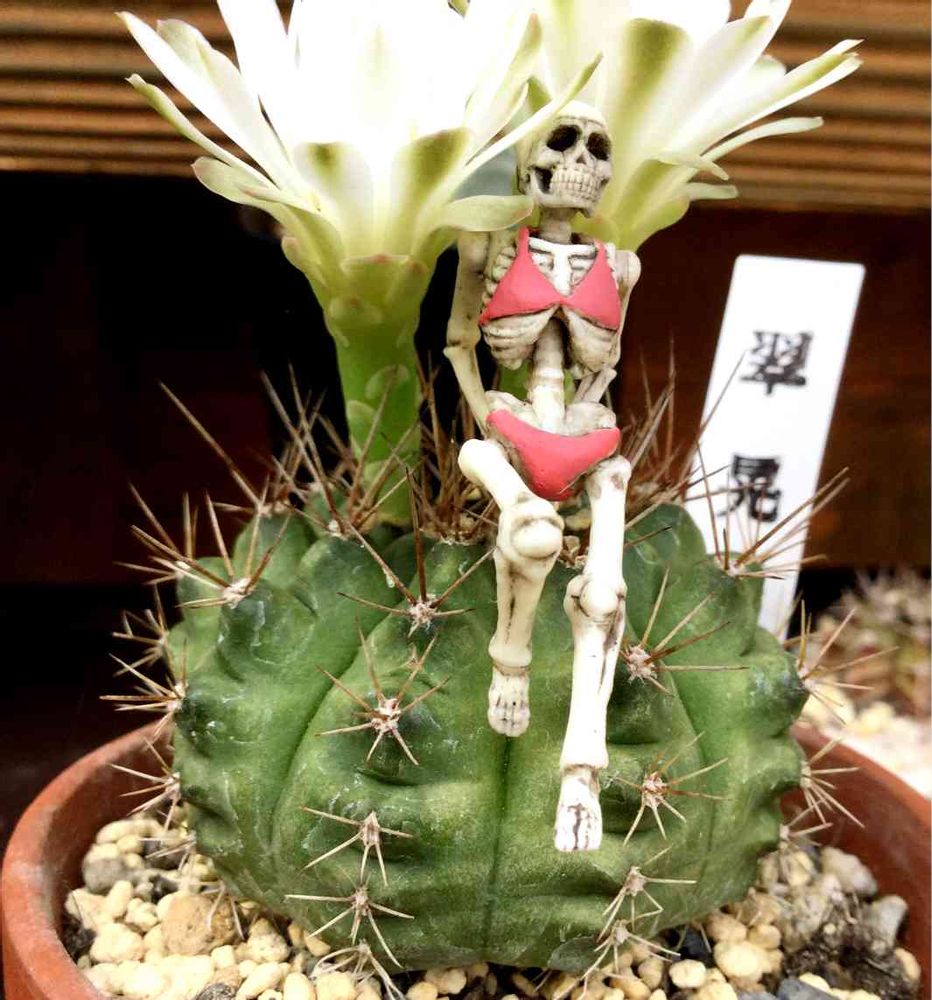 ビキニの骸骨ちゃん、コップのフチ子さん的なやつでいつもどれか鉢にくっつけてあるんです☺️✌️
