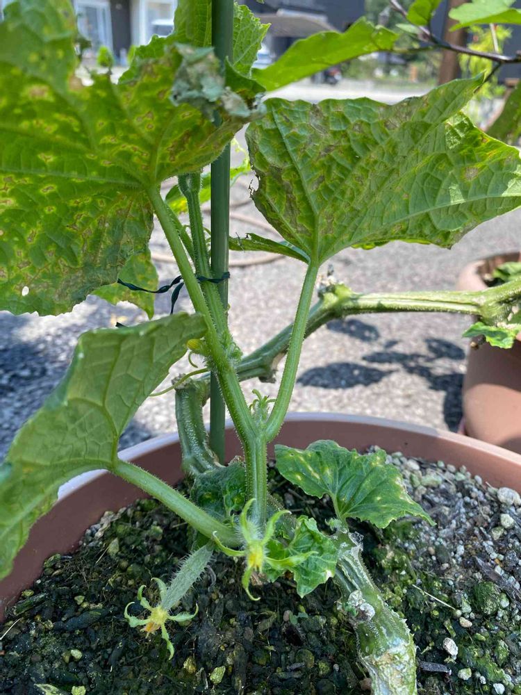 梅雨にうどん粉病でほとんどの葉っぱがダメになりましたが、葉っぱがあった節から小さい葉っぱが出てきてます😊