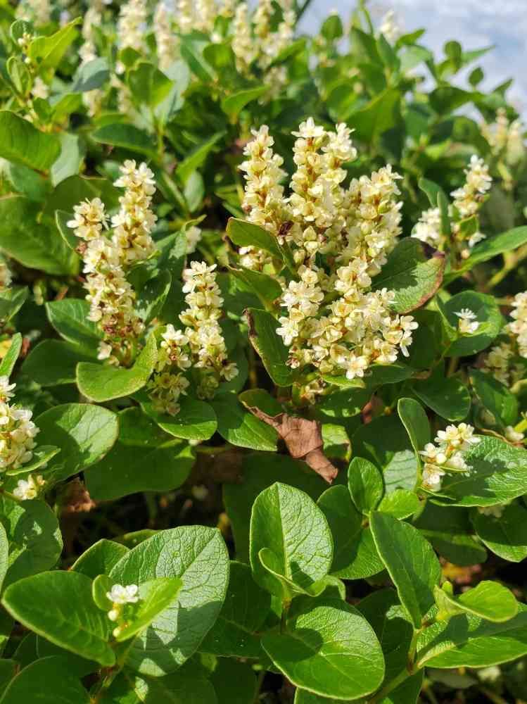 茎はよく分枝して、紅色を帯びる。葉は長さ4~12㎝の卵形、ほとんど柄がなく、基部は円形~広くさび形、両面とも無毛、縁に細毛が生える。花は普通は白~黄白色だが、淡紅色を帯びるものもある。花被は5深裂する。