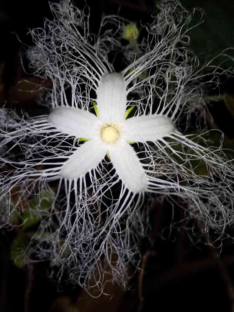 たくさんの白い糸が踊っているような姿も素敵ですが、真ん中の花粉?の黄色も素敵なカラスウリの雄花です。