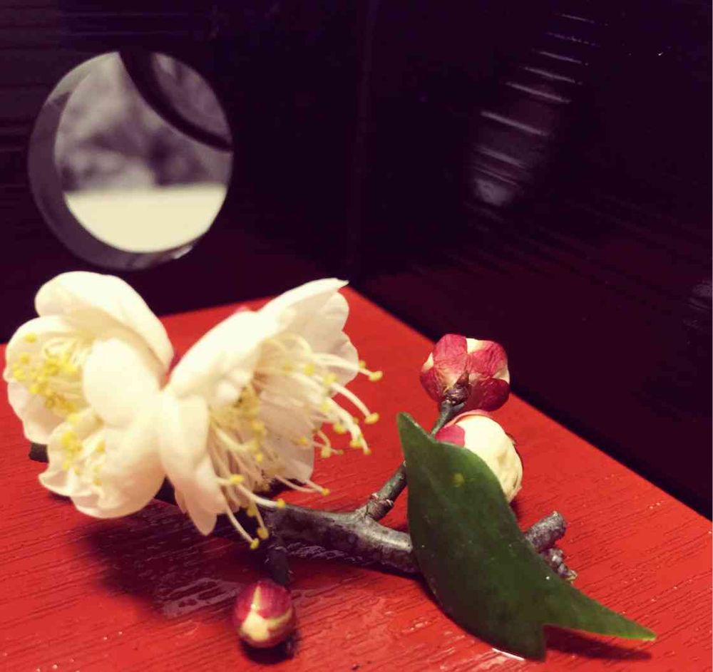 ご飯を食べに行ったお店で梅の小枝をいただきました。かわいいキュウリのウグイス付き♡