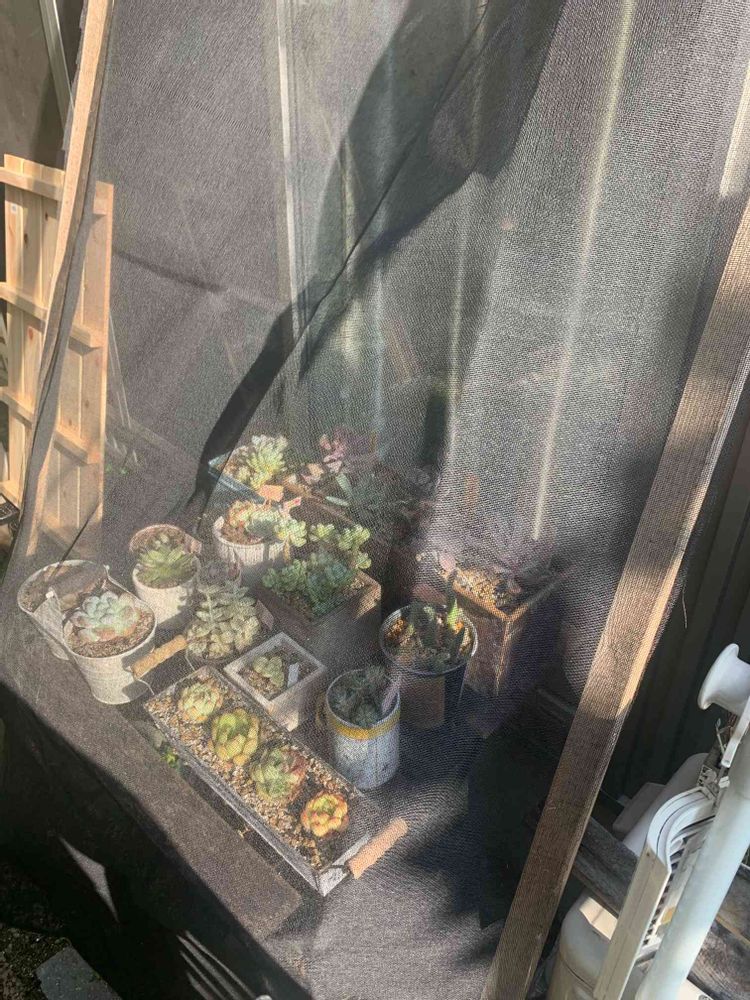 相方に頼んでいた寒冷紗。角材に寒冷紗を養生テープで貼り付けるだけというずさんな施工、、、