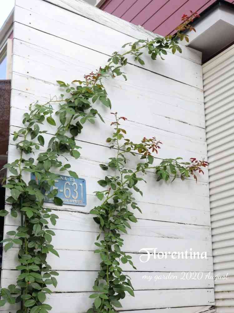 先程この春新苗でお迎えしたクリスティアーナがすでに2m越えと書きましたが、ちなみにこちらもこの春新苗でお迎えしたフロレンティーナです。こっちはまだ一輪も咲きません。完全に枝を伸ばすのに専念しているようで、黙々と枝を伸ばしていて、既に3mを越えています。つるバラの樹勢の強さ、恐るべし、です。秋には真っ赤な花を咲かせてくれるのかしら。。