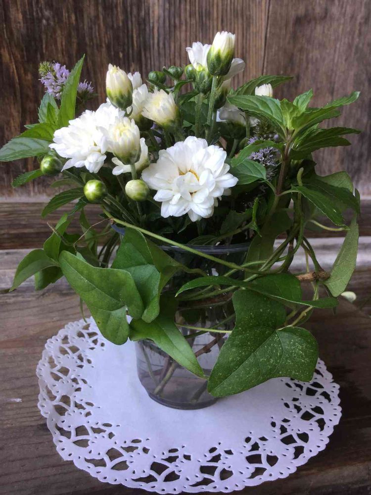 小菊、ミント、蔓植物のアレンジです。家の周りのものを活かします。パッションが止まりません。あの方に持って行こうか、あの方がいいか・・・