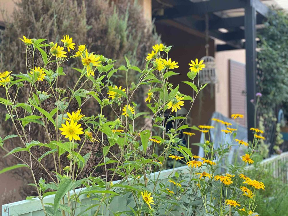 後から出てきて追い越して咲いているレモン色の🌼。これこそ宿根ひまわりらしい😅🙏