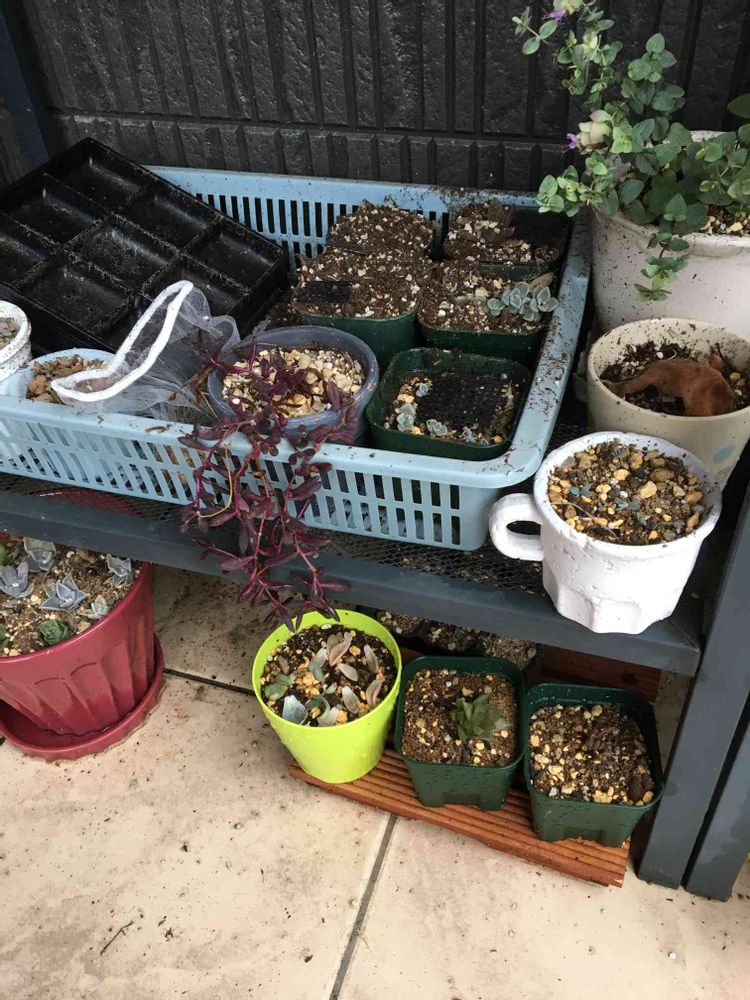 なんで?なんで?こうなった?葉挿しトレーやらがめちゃくちゃ😱苗が散乱、陶器の傘立ても倒れてる。。。※葉挿しトレーはカゴに入ってるけど、下に落ちてたのをカゴに置いた。