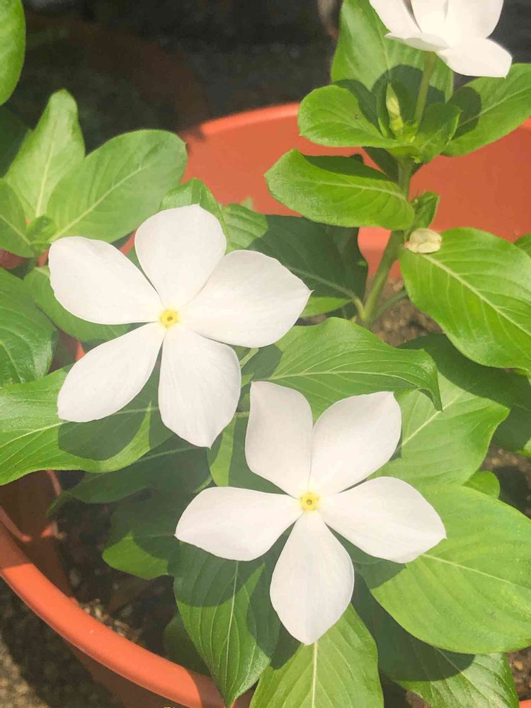 零れ種から咲いた日々草。一度元気がなくなったので切り戻しをしたらまた元気に❣️白が眩しい✨