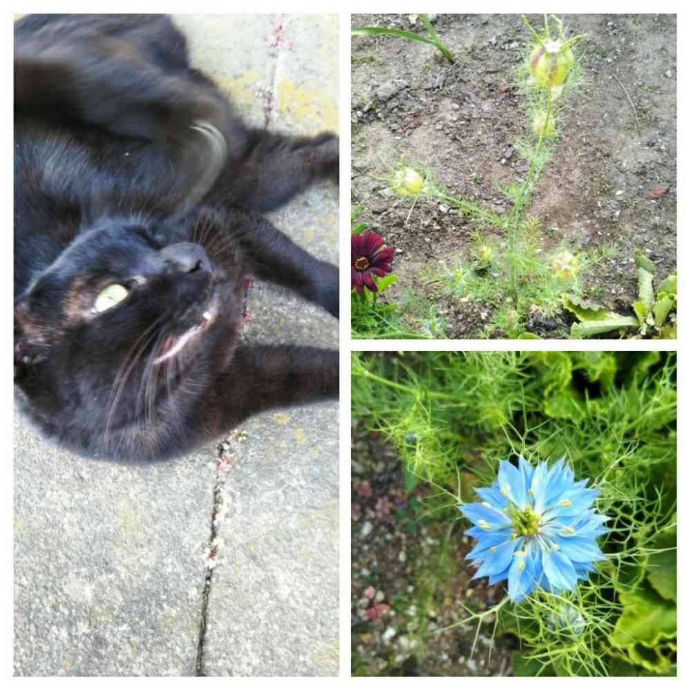 くろちゃんが1番涼しいところ知っているよね😃👍️ブルーのニゲラさん可愛いです💙