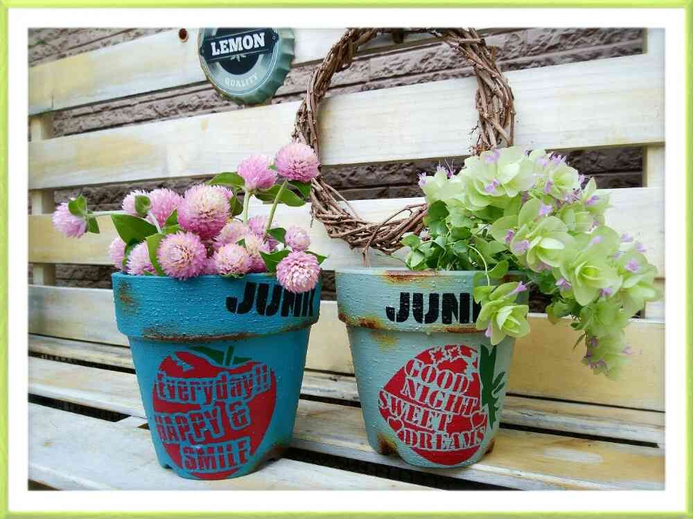 Junkな鉢にリンゴ🍎とイチゴ🍓のステンシルが可愛くて~👍
