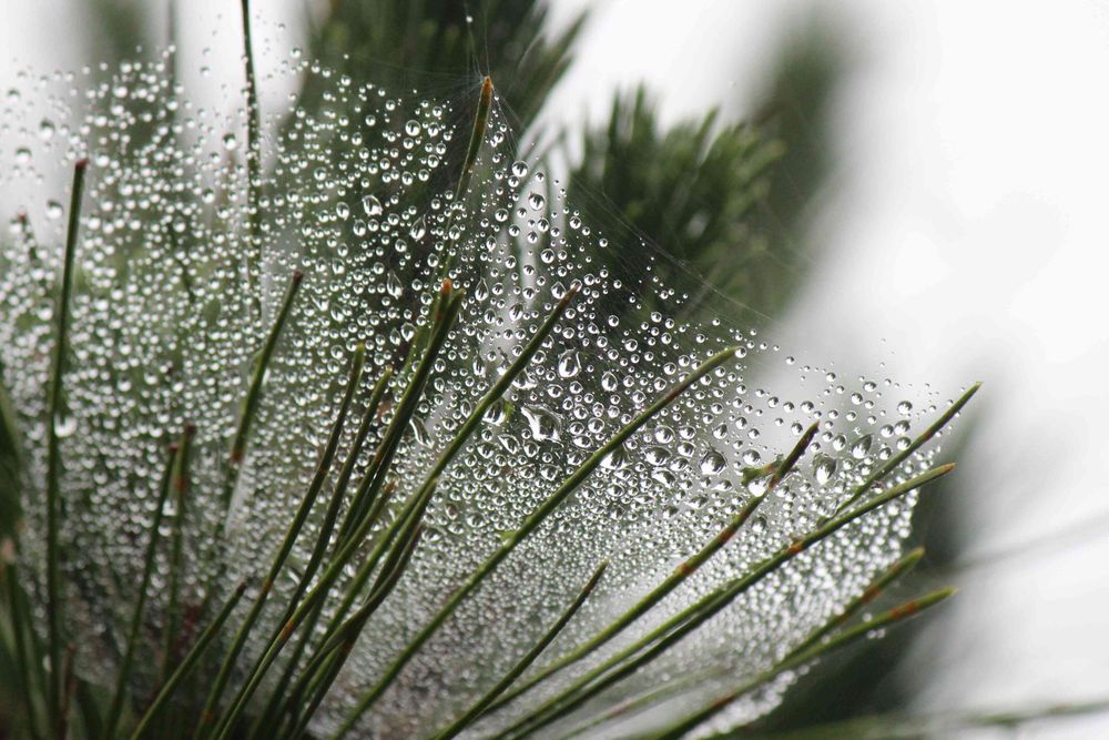 結構前(梅雨時期)に撮ったものですが、松に蜘蛛の巣、雨がいい感じに綺麗な組み合わせになっていました。今見ると、ちょっと涼しげかも?