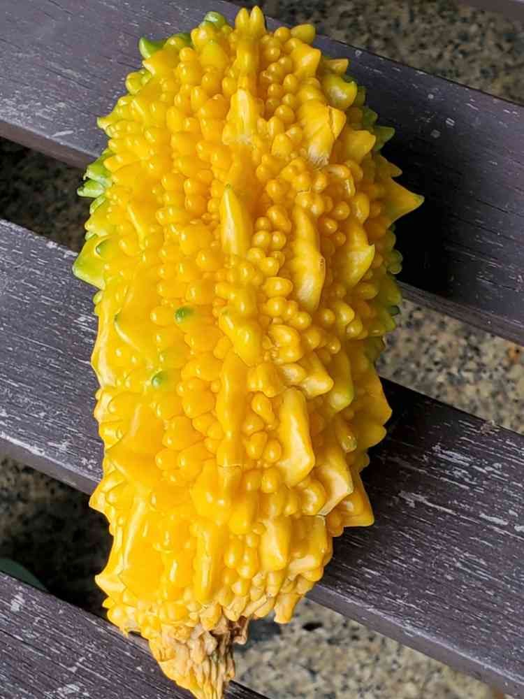 ゴーヤが緑から黄色になり破裂寸前‼️台所で破裂したら大変です。外に出してパチリと撮影😅